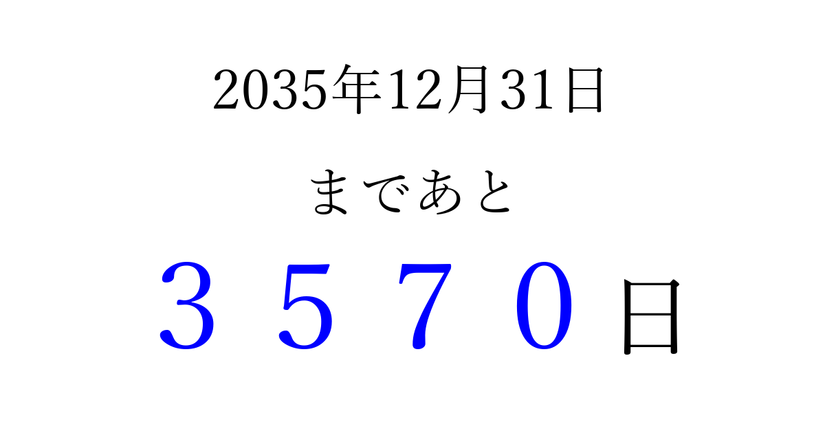 2035年12月31日(月)まで あと 9999 日です 追加すると、トップページからすぐ選べるようになります ※2026/03/23現在の結果です。 最新の状態に更新する ↓シェアして、タイムライン上にカウントダウンを表示しよう!↓ 📤 この結果を共有する Tweet シェア Threads Bluesky 別の日付でカウントダウン 2035年12月のカレンダー このページをブックマークに追加すると、いつでもカウントダウンを確認できます。 (PC: Ctrl+D / Mac: ⌘+D) hitome-notes.comでは以下のページも運営しています。 指定日と期間から日付を計算 | ガチャ確率計算・シミュレーション | プライバシー・ポリシー 運営者:Avocado