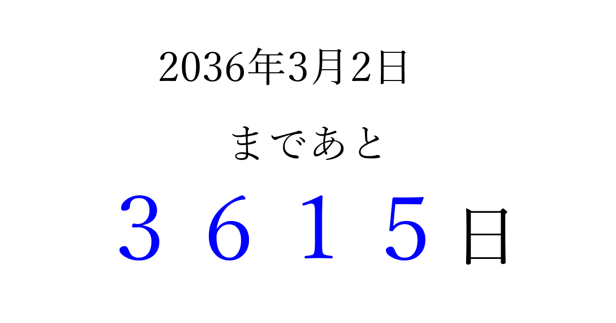 2036年3月2日(日)まで あと 9999 日です 追加すると、トップページからすぐ選べるようになります ※2026/04/09現在の結果です。 最新の状態に更新する ↓シェアして、タイムライン上にカウントダウンを表示しよう!↓ 📤 この結果を共有する Tweet シェア Threads Bluesky 別の日付でカウントダウン 2036年3月のカレンダー このページをブックマークに追加すると、いつでもカウントダウンを確認できます。 (PC: Ctrl+D / Mac: ⌘+D) hitome-notes.comでは以下のページも運営しています。 指定日と期間から日付を計算 | ガチャ確率計算・シミュレーション | プライバシー・ポリシー 運営者:Avocado