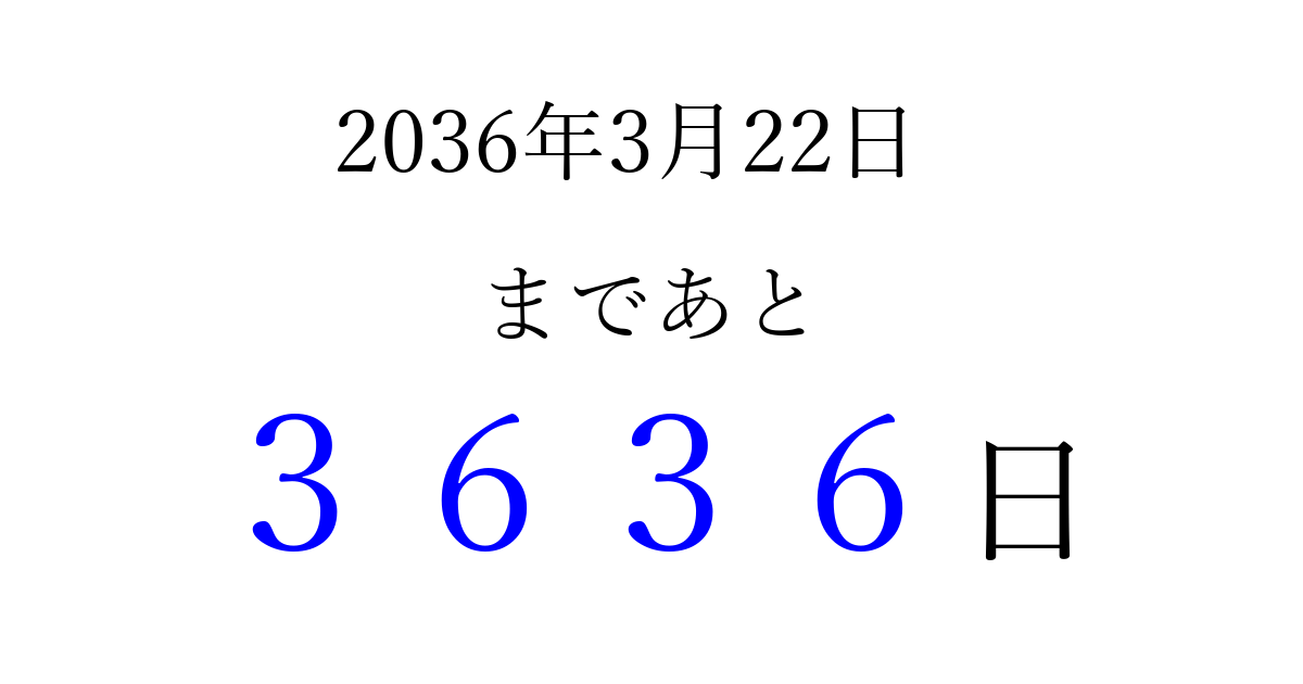 2036年3月22日(土)まで あと 9999 日です 追加すると、トップページからすぐ選べるようになります ※2026/04/08現在の結果です。 最新の状態に更新する ↓シェアして、タイムライン上にカウントダウンを表示しよう!↓ 📤 この結果を共有する Tweet シェア Threads Bluesky 別の日付でカウントダウン 2036年3月のカレンダー このページをブックマークに追加すると、いつでもカウントダウンを確認できます。 (PC: Ctrl+D / Mac: ⌘+D) hitome-notes.comでは以下のページも運営しています。 指定日と期間から日付を計算 | ガチャ確率計算・シミュレーション | プライバシー・ポリシー 運営者:Avocado