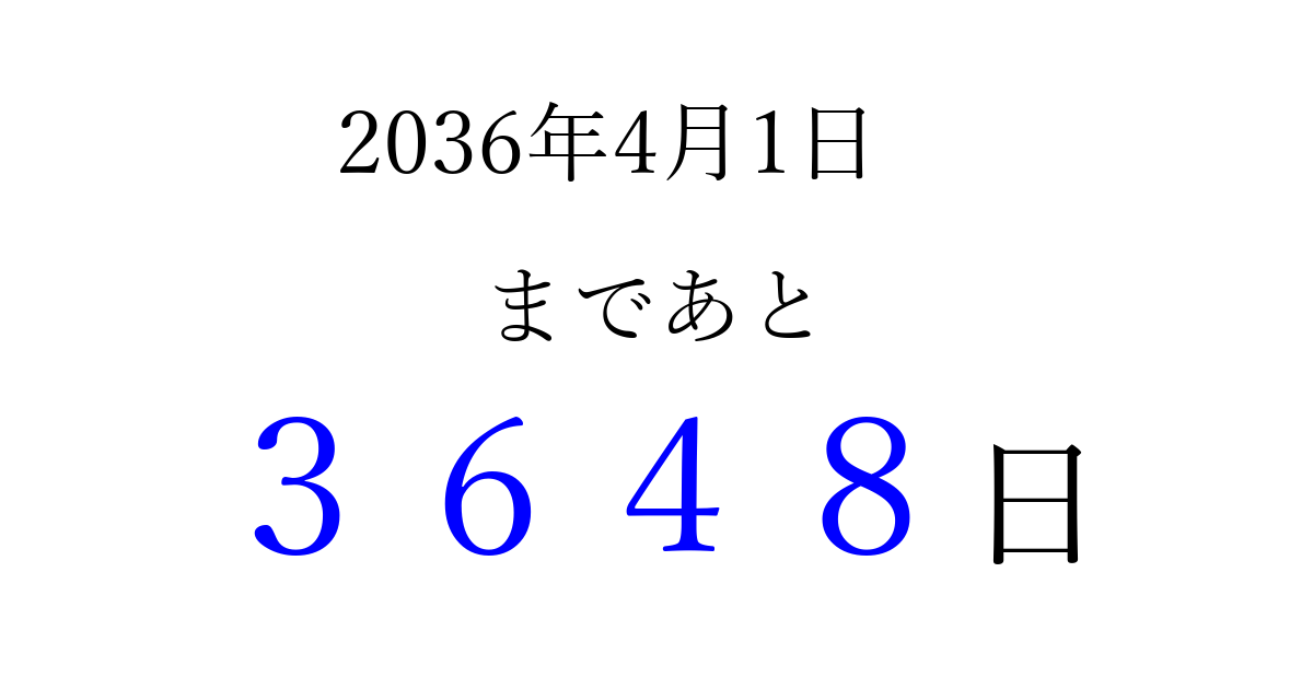 2036年4月1日(火)まで あと 9999 日です 追加すると、トップページからすぐ選べるようになります ※2026/04/06現在の結果です。 最新の状態に更新する ↓シェアして、タイムライン上にカウントダウンを表示しよう!↓ 📤 この結果を共有する Tweet シェア Threads Bluesky 別の日付でカウントダウン 2036年4月のカレンダー このページをブックマークに追加すると、いつでもカウントダウンを確認できます。 (PC: Ctrl+D / Mac: ⌘+D) hitome-notes.comでは以下のページも運営しています。 指定日と期間から日付を計算 | ガチャ確率計算・シミュレーション | プライバシー・ポリシー 運営者:Avocado