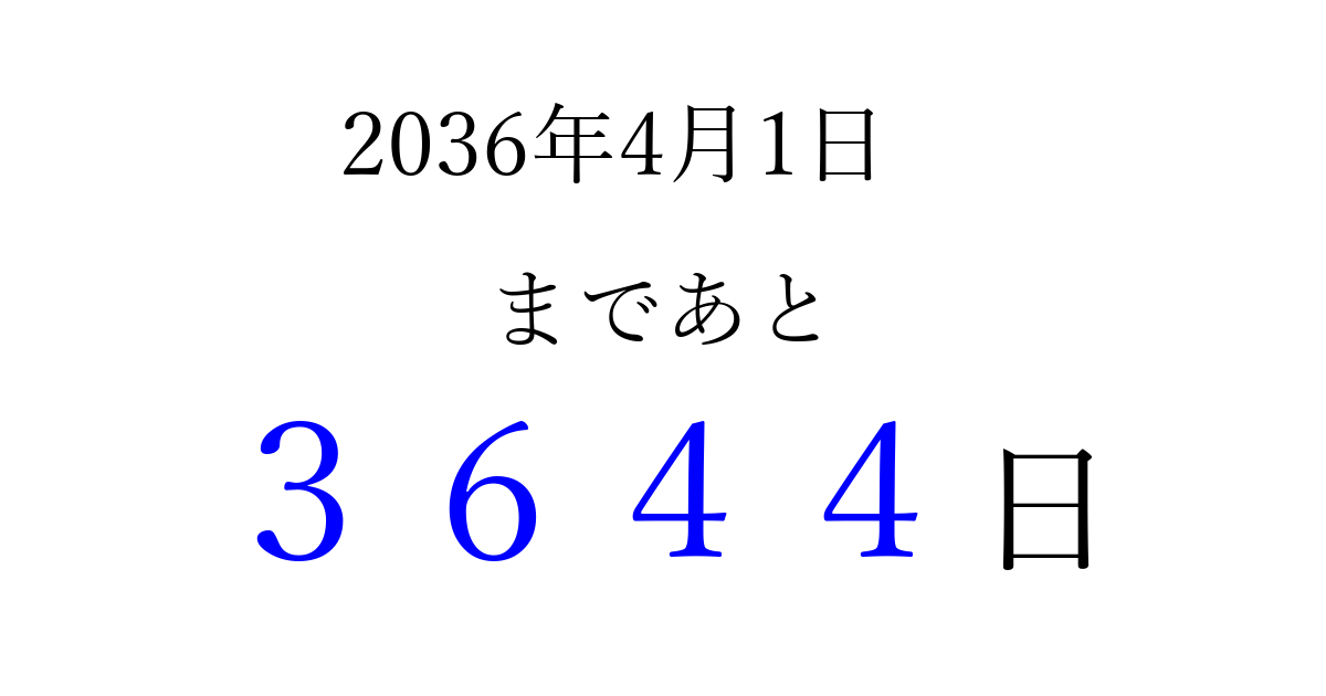 2036年4月1日(火)まで あと 9999 日です 追加すると、トップページからすぐ選べるようになります ※2026/04/10現在の結果です。 最新の状態に更新する ↓シェアして、タイムライン上にカウントダウンを表示しよう!↓ 📤 この結果を共有する Tweet シェア Threads Bluesky 別の日付でカウントダウン 2036年4月のカレンダー このページをブックマークに追加すると、いつでもカウントダウンを確認できます。 (PC: Ctrl+D / Mac: ⌘+D) hitome-notes.comでは以下のページも運営しています。 指定日と期間から日付を計算 | ガチャ確率計算・シミュレーション | プライバシー・ポリシー 運営者:Avocado