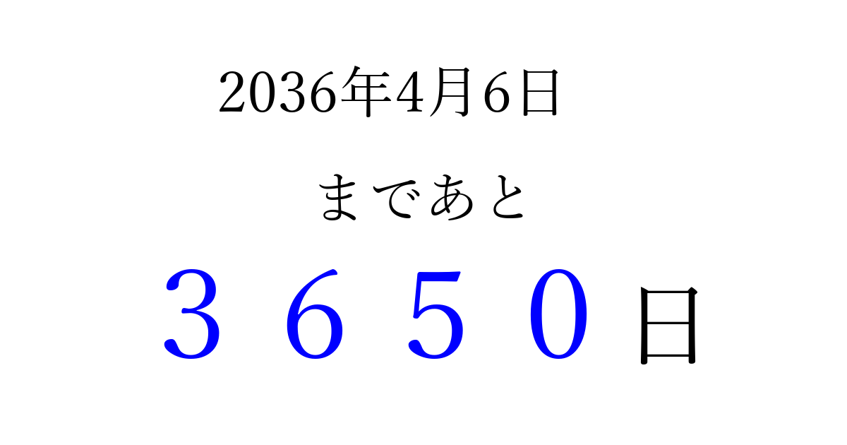 2036年4月6日(日)まで あと 9999 日です 追加すると、トップページからすぐ選べるようになります ※2026/04/09現在の結果です。 最新の状態に更新する ↓シェアして、タイムライン上にカウントダウンを表示しよう!↓ 📤 この結果を共有する Tweet シェア Threads Bluesky 別の日付でカウントダウン 2036年4月のカレンダー このページをブックマークに追加すると、いつでもカウントダウンを確認できます。 (PC: Ctrl+D / Mac: ⌘+D) hitome-notes.comでは以下のページも運営しています。 指定日と期間から日付を計算 | ガチャ確率計算・シミュレーション | プライバシー・ポリシー 運営者:Avocado