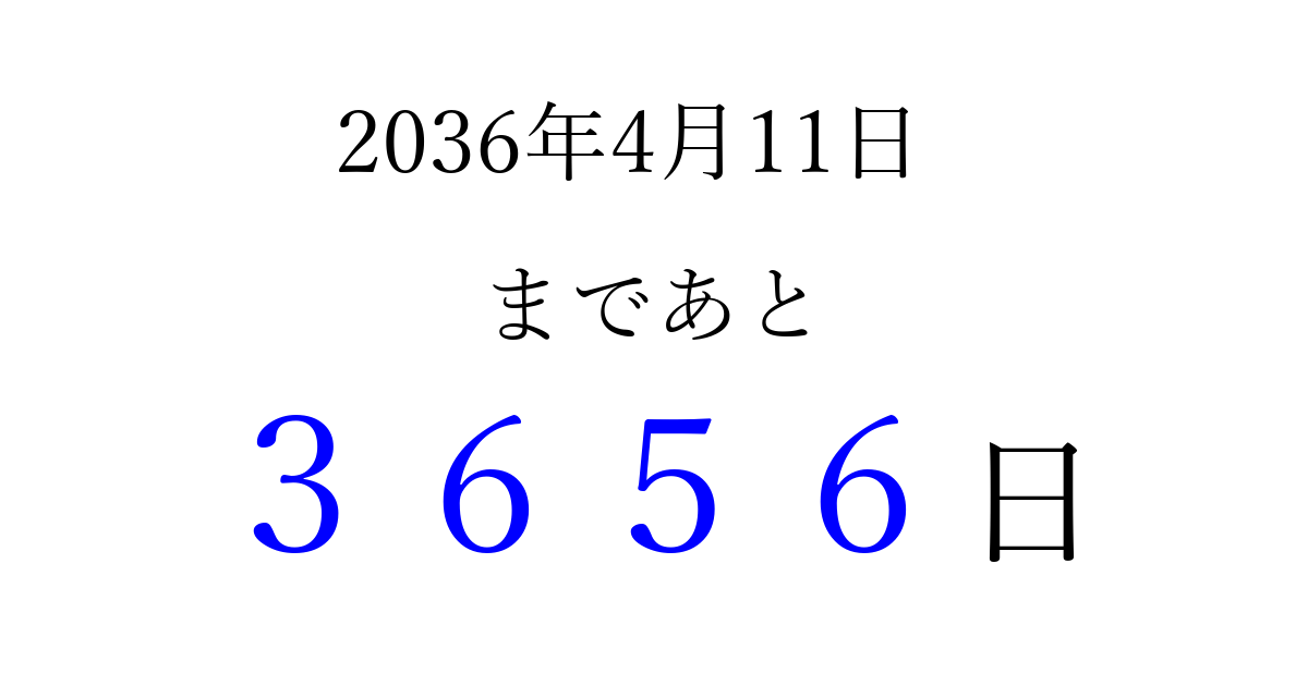 2036年4月11日(金)まで あと 9999 日です 追加すると、トップページからすぐ選べるようになります ※2026/04/08現在の結果です。 最新の状態に更新する ↓シェアして、タイムライン上にカウントダウンを表示しよう!↓ 📤 この結果を共有する Tweet シェア Threads Bluesky 別の日付でカウントダウン 2036年4月のカレンダー このページをブックマークに追加すると、いつでもカウントダウンを確認できます。 (PC: Ctrl+D / Mac: ⌘+D) hitome-notes.comでは以下のページも運営しています。 指定日と期間から日付を計算 | ガチャ確率計算・シミュレーション | プライバシー・ポリシー 運営者:Avocado