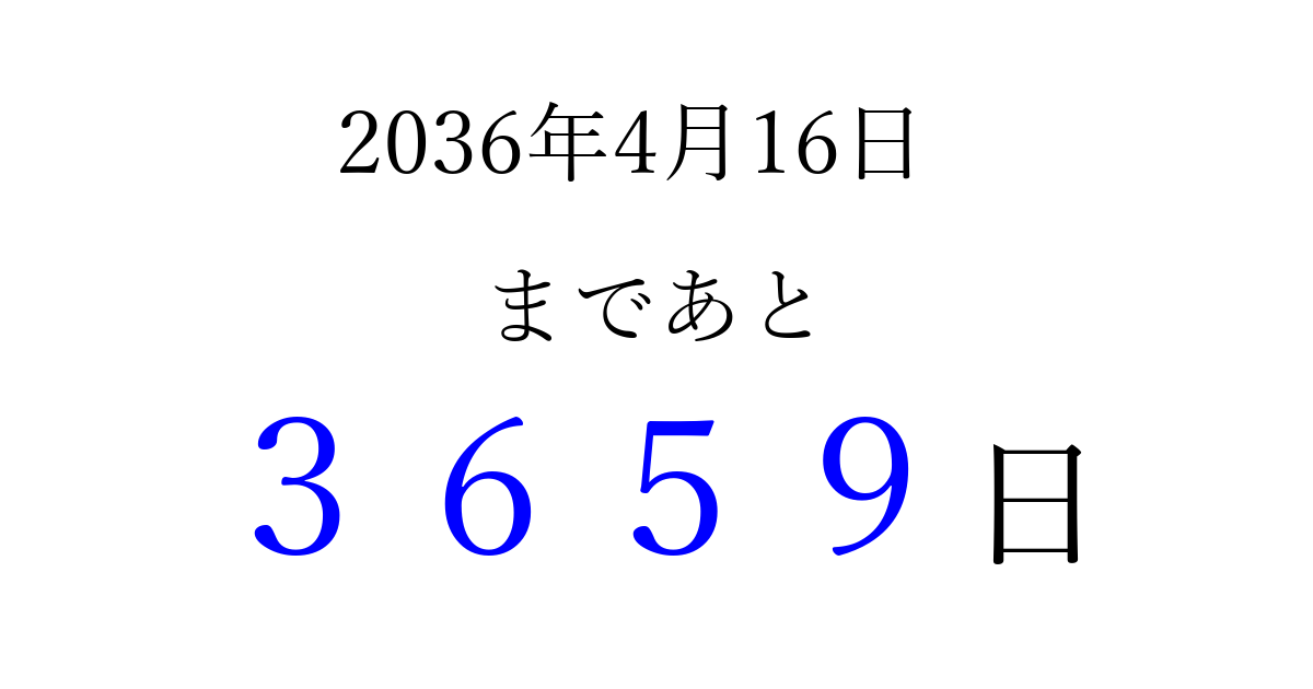 2036年4月16日(水)まで あと 9999 日です 追加すると、トップページからすぐ選べるようになります ※2026/04/10現在の結果です。 最新の状態に更新する ↓シェアして、タイムライン上にカウントダウンを表示しよう!↓ 📤 この結果を共有する Tweet シェア Threads Bluesky 別の日付でカウントダウン 2036年4月のカレンダー このページをブックマークに追加すると、いつでもカウントダウンを確認できます。 (PC: Ctrl+D / Mac: ⌘+D) hitome-notes.comでは以下のページも運営しています。 指定日と期間から日付を計算 | ガチャ確率計算・シミュレーション | プライバシー・ポリシー 運営者:Avocado