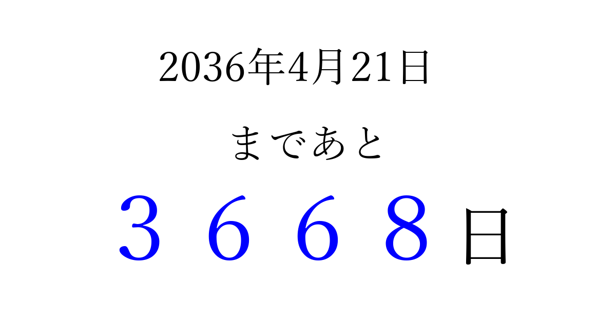 2036年4月21日(月)まで あと 9999 日です 追加すると、トップページからすぐ選べるようになります ※2026/04/06現在の結果です。 最新の状態に更新する ↓シェアして、タイムライン上にカウントダウンを表示しよう!↓ 📤 この結果を共有する Tweet シェア Threads Bluesky 別の日付でカウントダウン 2036年4月のカレンダー このページをブックマークに追加すると、いつでもカウントダウンを確認できます。 (PC: Ctrl+D / Mac: ⌘+D) hitome-notes.comでは以下のページも運営しています。 指定日と期間から日付を計算 | ガチャ確率計算・シミュレーション | プライバシー・ポリシー 運営者:Avocado