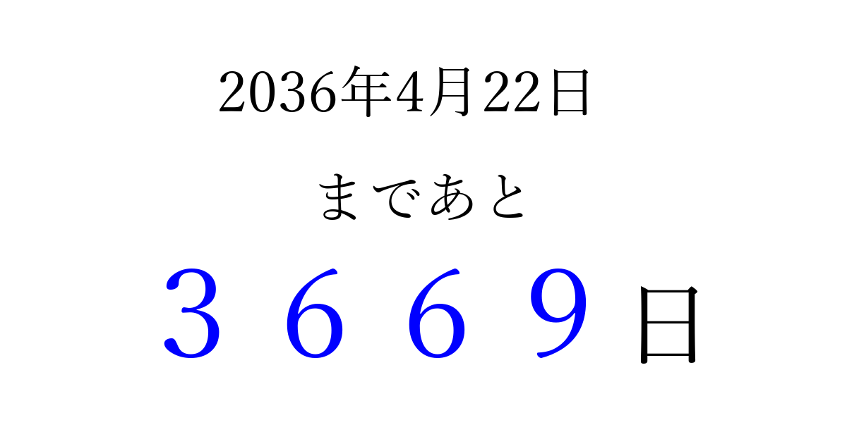 2036年4月22日(火)まで あと 9999 日です 追加すると、トップページからすぐ選べるようになります ※2026/04/06現在の結果です。 最新の状態に更新する ↓シェアして、タイムライン上にカウントダウンを表示しよう!↓ 📤 この結果を共有する Tweet シェア Threads Bluesky 別の日付でカウントダウン 2036年4月のカレンダー このページをブックマークに追加すると、いつでもカウントダウンを確認できます。 (PC: Ctrl+D / Mac: ⌘+D) hitome-notes.comでは以下のページも運営しています。 指定日と期間から日付を計算 | ガチャ確率計算・シミュレーション | プライバシー・ポリシー 運営者:Avocado