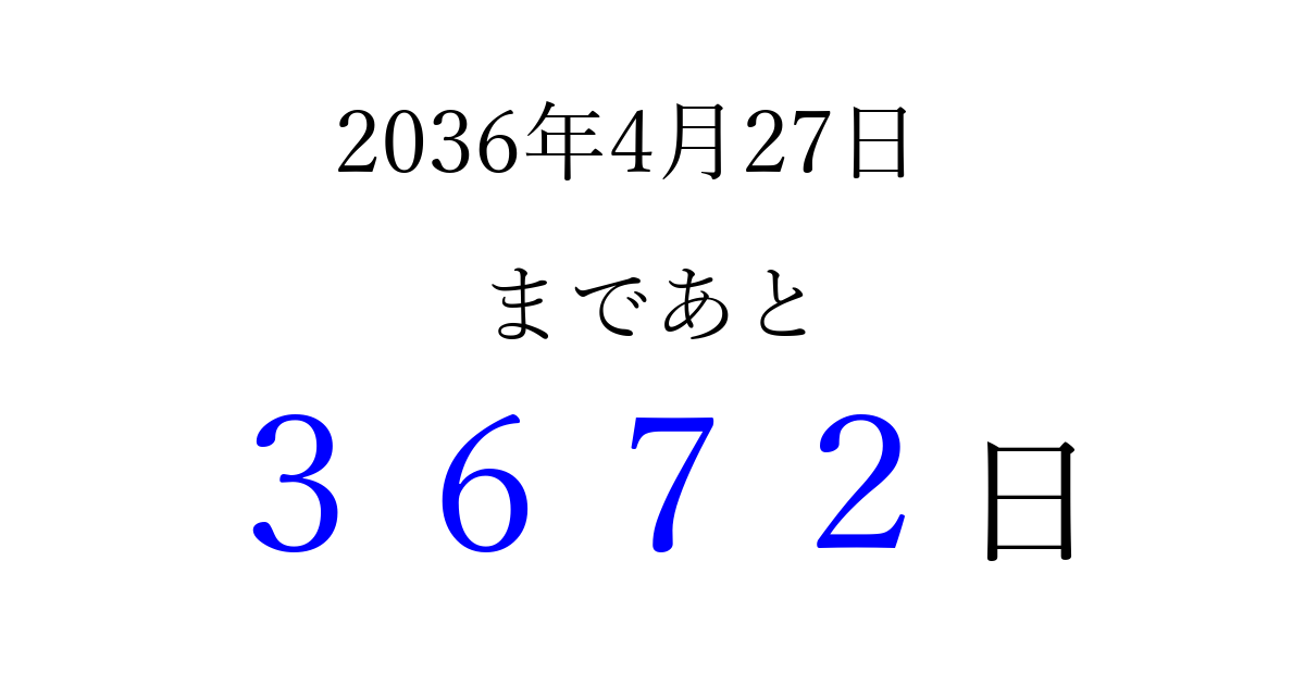 2036年4月27日(日)まで あと 9999 日です 追加すると、トップページからすぐ選べるようになります ※2026/04/08現在の結果です。 最新の状態に更新する ↓シェアして、タイムライン上にカウントダウンを表示しよう!↓ 📤 この結果を共有する Tweet シェア Threads Bluesky 別の日付でカウントダウン 2036年4月のカレンダー このページをブックマークに追加すると、いつでもカウントダウンを確認できます。 (PC: Ctrl+D / Mac: ⌘+D) hitome-notes.comでは以下のページも運営しています。 指定日と期間から日付を計算 | ガチャ確率計算・シミュレーション | プライバシー・ポリシー 運営者:Avocado