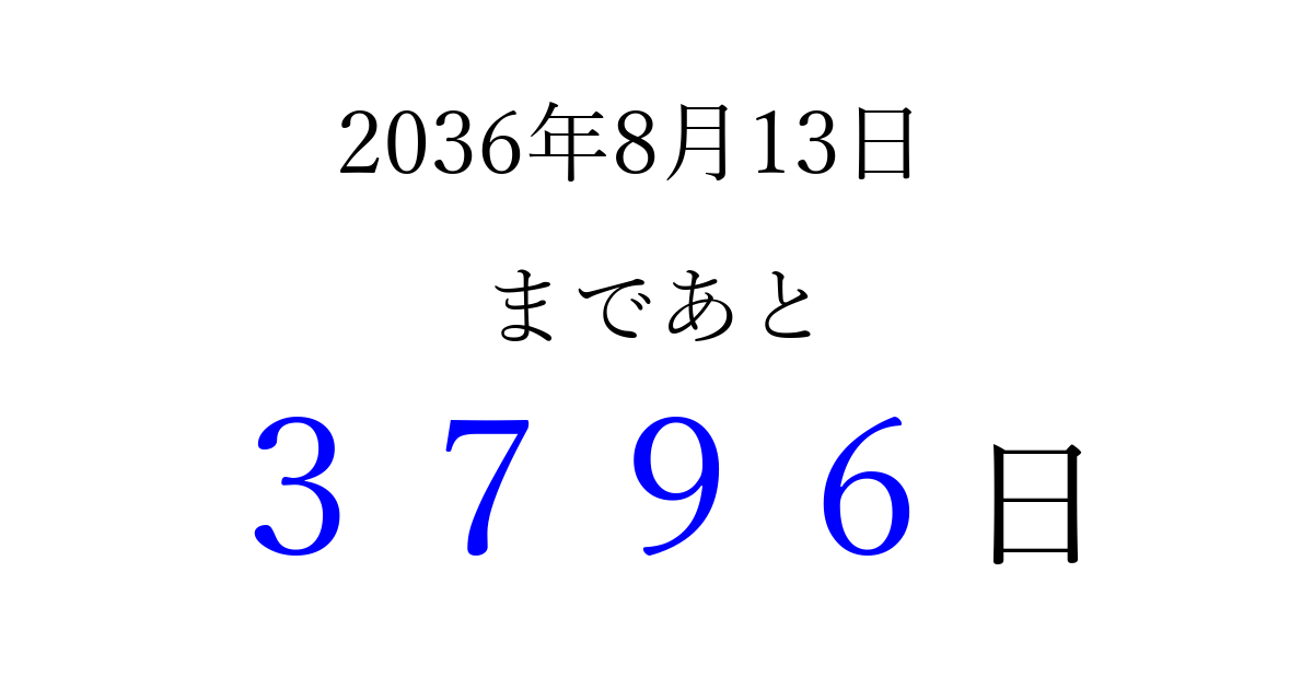2036年8月13日(水)まで あと 9999 日です 追加すると、トップページからすぐ選べるようになります ※2026/03/23現在の結果です。 最新の状態に更新する ↓シェアして、タイムライン上にカウントダウンを表示しよう!↓ 📤 この結果を共有する Tweet シェア Threads Bluesky 別の日付でカウントダウン 2036年8月のカレンダー このページをブックマークに追加すると、いつでもカウントダウンを確認できます。 (PC: Ctrl+D / Mac: ⌘+D) hitome-notes.comでは以下のページも運営しています。 指定日と期間から日付を計算 | ガチャ確率計算・シミュレーション | プライバシー・ポリシー 運営者:Avocado