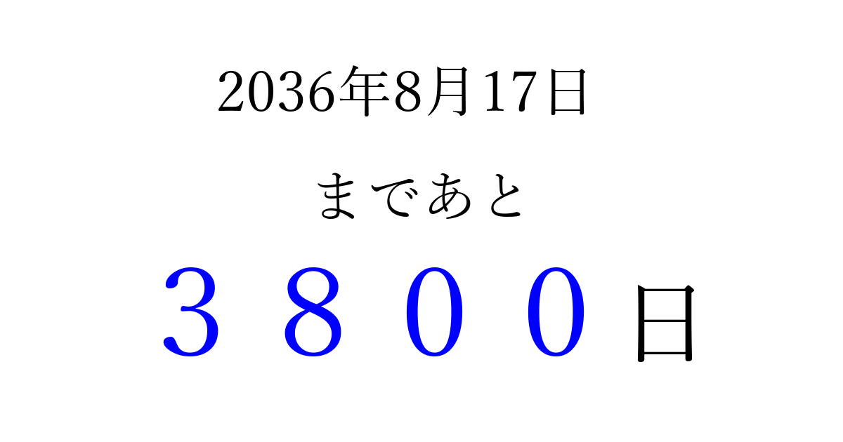 2036年8月17日(日)まで あと 9999 日です 追加すると、トップページからすぐ選べるようになります ※2026/03/23現在の結果です。 最新の状態に更新する ↓シェアして、タイムライン上にカウントダウンを表示しよう!↓ 📤 この結果を共有する Tweet シェア Threads Bluesky 別の日付でカウントダウン 2036年8月のカレンダー このページをブックマークに追加すると、いつでもカウントダウンを確認できます。 (PC: Ctrl+D / Mac: ⌘+D) hitome-notes.comでは以下のページも運営しています。 指定日と期間から日付を計算 | ガチャ確率計算・シミュレーション | プライバシー・ポリシー 運営者:Avocado