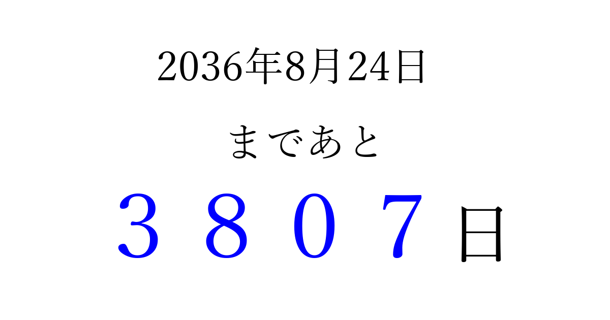 2036年8月24日(日)まで あと 9999 日です 追加すると、トップページからすぐ選べるようになります ※2026/03/23現在の結果です。 最新の状態に更新する ↓シェアして、タイムライン上にカウントダウンを表示しよう!↓ 📤 この結果を共有する Tweet シェア Threads Bluesky 別の日付でカウントダウン 2036年8月のカレンダー このページをブックマークに追加すると、いつでもカウントダウンを確認できます。 (PC: Ctrl+D / Mac: ⌘+D) hitome-notes.comでは以下のページも運営しています。 指定日と期間から日付を計算 | ガチャ確率計算・シミュレーション | プライバシー・ポリシー 運営者:Avocado