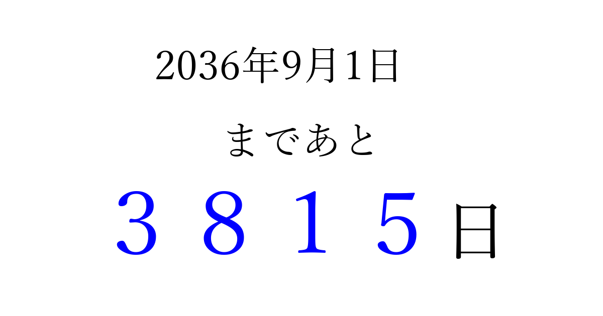 2036年9月1日(月)まで あと 9999 日です 追加すると、トップページからすぐ選べるようになります ※2026/03/23現在の結果です。 最新の状態に更新する ↓シェアして、タイムライン上にカウントダウンを表示しよう!↓ 📤 この結果を共有する Tweet シェア Threads Bluesky 別の日付でカウントダウン 2036年9月のカレンダー このページをブックマークに追加すると、いつでもカウントダウンを確認できます。 (PC: Ctrl+D / Mac: ⌘+D) hitome-notes.comでは以下のページも運営しています。 指定日と期間から日付を計算 | ガチャ確率計算・シミュレーション | プライバシー・ポリシー 運営者:Avocado