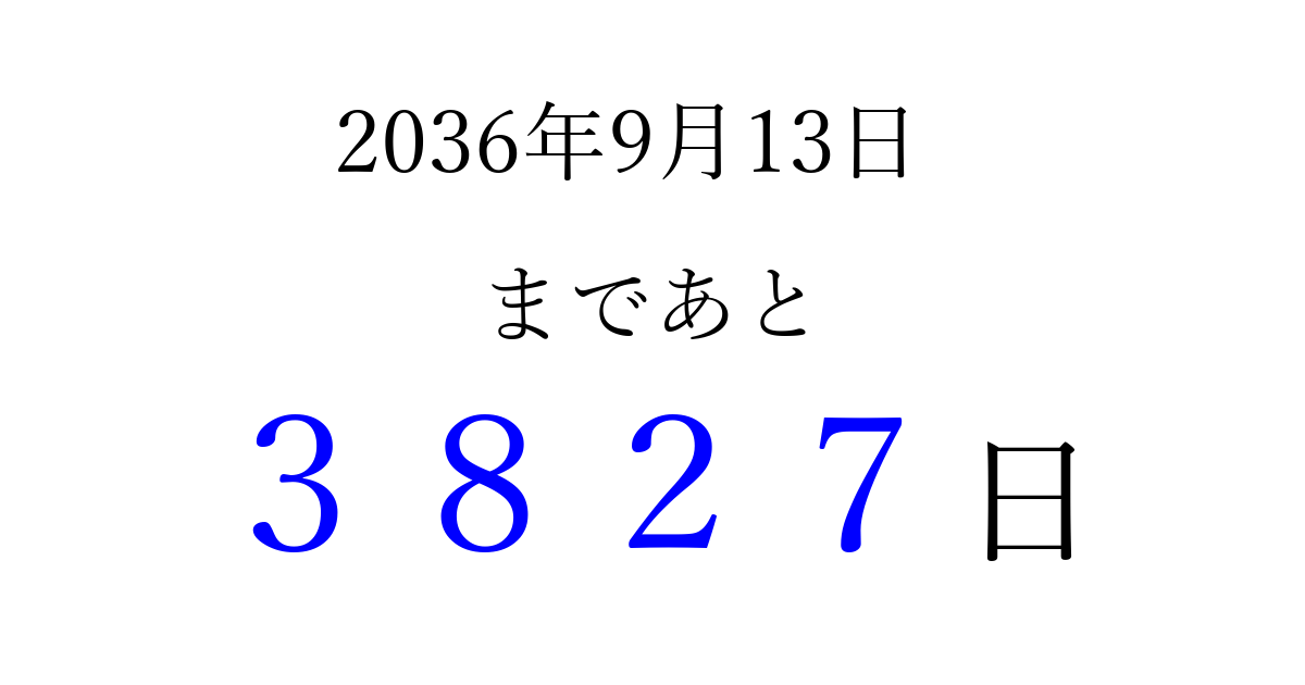 2036年9月13日(土)まで あと 9999 日です 追加すると、トップページからすぐ選べるようになります ※2026/03/23現在の結果です。 最新の状態に更新する ↓シェアして、タイムライン上にカウントダウンを表示しよう!↓ 📤 この結果を共有する Tweet シェア Threads Bluesky 別の日付でカウントダウン 2036年9月のカレンダー このページをブックマークに追加すると、いつでもカウントダウンを確認できます。 (PC: Ctrl+D / Mac: ⌘+D) hitome-notes.comでは以下のページも運営しています。 指定日と期間から日付を計算 | ガチャ確率計算・シミュレーション | プライバシー・ポリシー 運営者:Avocado