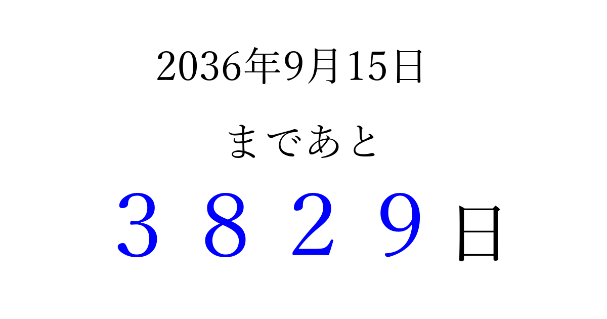 2036年9月15日(月)まで あと 9999 日です 追加すると、トップページからすぐ選べるようになります ※2026/03/23現在の結果です。 最新の状態に更新する ↓シェアして、タイムライン上にカウントダウンを表示しよう!↓ 📤 この結果を共有する Tweet シェア Threads Bluesky 別の日付でカウントダウン 2036年9月のカレンダー このページをブックマークに追加すると、いつでもカウントダウンを確認できます。 (PC: Ctrl+D / Mac: ⌘+D) hitome-notes.comでは以下のページも運営しています。 指定日と期間から日付を計算 | ガチャ確率計算・シミュレーション | プライバシー・ポリシー 運営者:Avocado