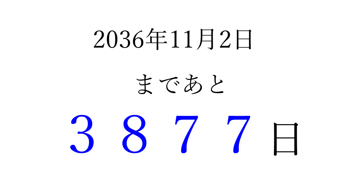 2036年11月2日(日)まで あと 9999 日です 追加すると、トップページからすぐ選べるようになります ※2026/03/23現在の結果です。 最新の状態に更新する ↓シェアして、タイムライン上にカウントダウンを表示しよう!↓ 📤 この結果を共有する Tweet シェア Threads Bluesky 別の日付でカウントダウン 2036年11月のカレンダー このページをブックマークに追加すると、いつでもカウントダウンを確認できます。 (PC: Ctrl+D / Mac: ⌘+D) hitome-notes.comでは以下のページも運営しています。 指定日と期間から日付を計算 | ガチャ確率計算・シミュレーション | プライバシー・ポリシー 運営者:Avocado