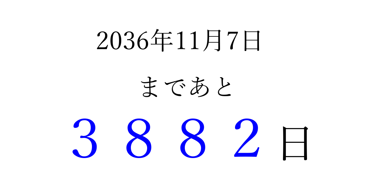 2036年11月7日(金)まで あと 9999 日です 追加すると、トップページからすぐ選べるようになります ※2026/03/23現在の結果です。 最新の状態に更新する ↓シェアして、タイムライン上にカウントダウンを表示しよう!↓ 📤 この結果を共有する Tweet シェア Threads Bluesky 別の日付でカウントダウン 2036年11月のカレンダー このページをブックマークに追加すると、いつでもカウントダウンを確認できます。 (PC: Ctrl+D / Mac: ⌘+D) hitome-notes.comでは以下のページも運営しています。 指定日と期間から日付を計算 | ガチャ確率計算・シミュレーション | プライバシー・ポリシー 運営者:Avocado