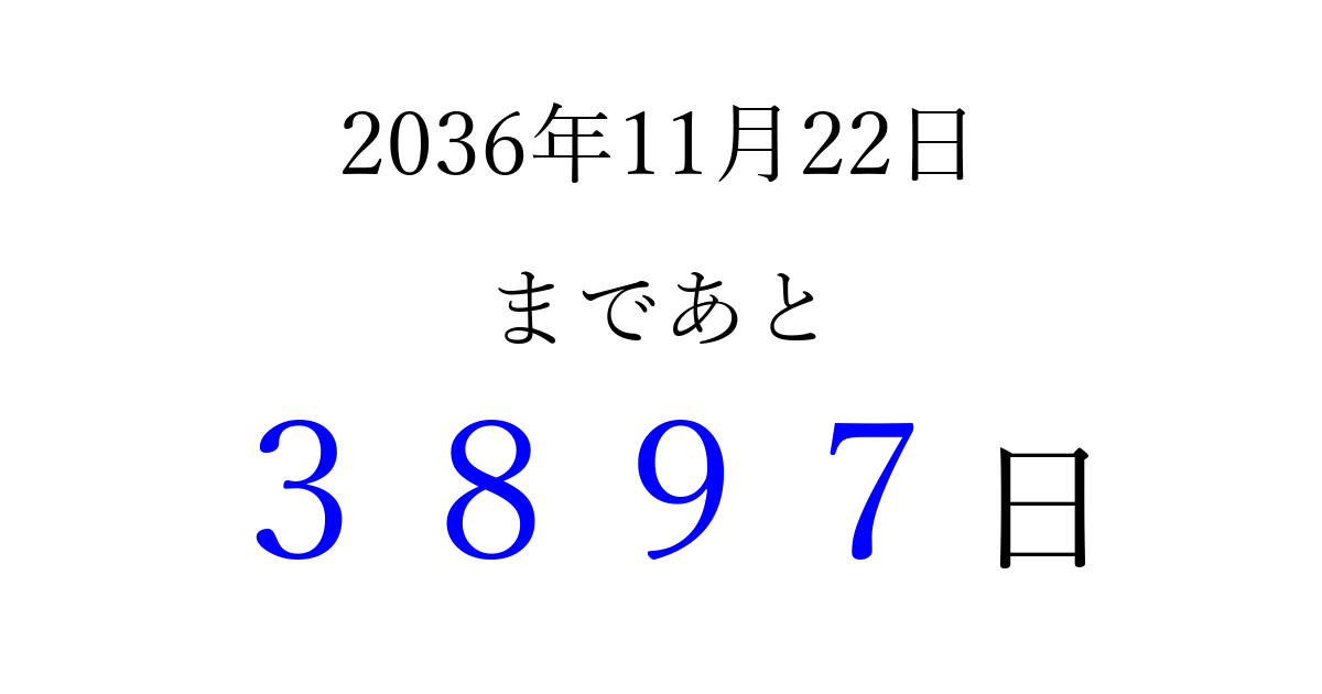 2036年11月22日(土)まで あと 9999 日です 追加すると、トップページからすぐ選べるようになります ※2026/03/23現在の結果です。 最新の状態に更新する ↓シェアして、タイムライン上にカウントダウンを表示しよう!↓ 📤 この結果を共有する Tweet シェア Threads Bluesky 別の日付でカウントダウン 2036年11月のカレンダー このページをブックマークに追加すると、いつでもカウントダウンを確認できます。 (PC: Ctrl+D / Mac: ⌘+D) hitome-notes.comでは以下のページも運営しています。 指定日と期間から日付を計算 | ガチャ確率計算・シミュレーション | プライバシー・ポリシー 運営者:Avocado