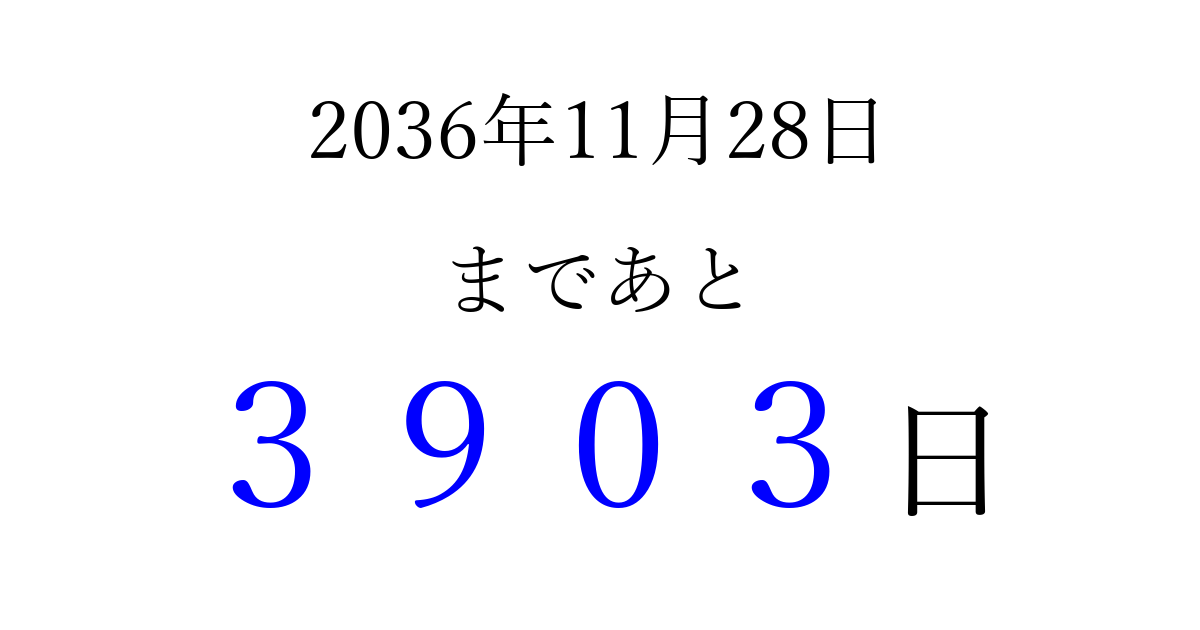 2036年11月28日(金)まで あと 9999 日です 追加すると、トップページからすぐ選べるようになります ※2026/03/23現在の結果です。 最新の状態に更新する ↓シェアして、タイムライン上にカウントダウンを表示しよう!↓ 📤 この結果を共有する Tweet シェア Threads Bluesky 別の日付でカウントダウン 2036年11月のカレンダー このページをブックマークに追加すると、いつでもカウントダウンを確認できます。 (PC: Ctrl+D / Mac: ⌘+D) hitome-notes.comでは以下のページも運営しています。 指定日と期間から日付を計算 | ガチャ確率計算・シミュレーション | プライバシー・ポリシー 運営者:Avocado