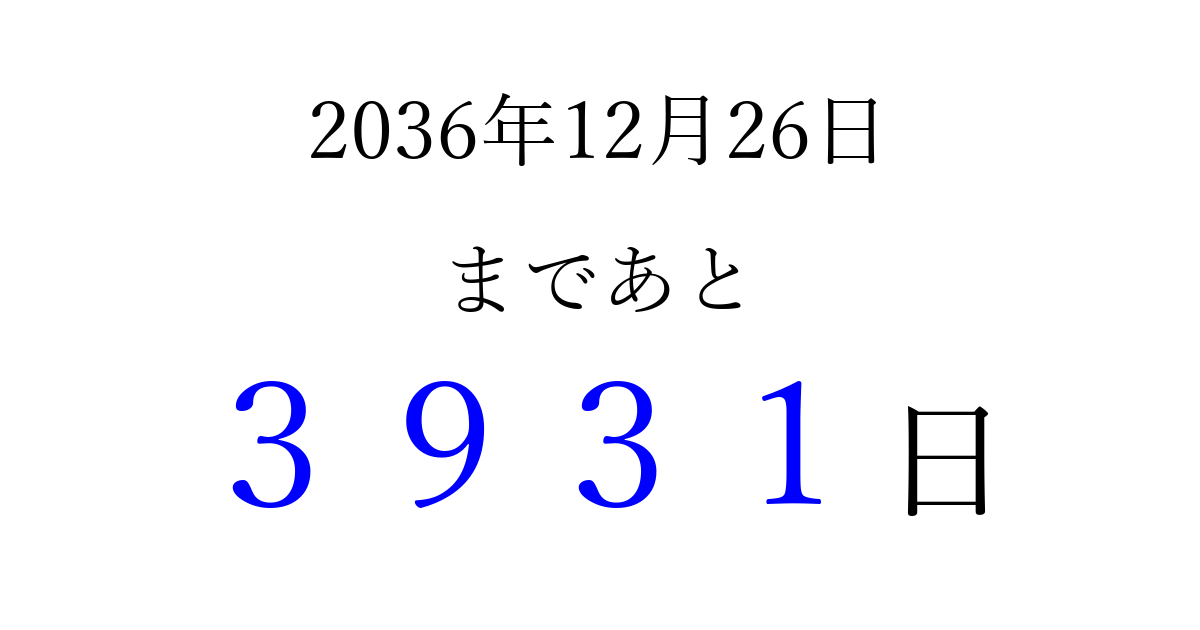 2036年12月26日(金)まで あと 9999 日です 追加すると、トップページからすぐ選べるようになります ※2026/03/23現在の結果です。 最新の状態に更新する ↓シェアして、タイムライン上にカウントダウンを表示しよう!↓ 📤 この結果を共有する Tweet シェア Threads Bluesky 別の日付でカウントダウン 2036年12月のカレンダー このページをブックマークに追加すると、いつでもカウントダウンを確認できます。 (PC: Ctrl+D / Mac: ⌘+D) hitome-notes.comでは以下のページも運営しています。 指定日と期間から日付を計算 | ガチャ確率計算・シミュレーション | プライバシー・ポリシー 運営者:Avocado