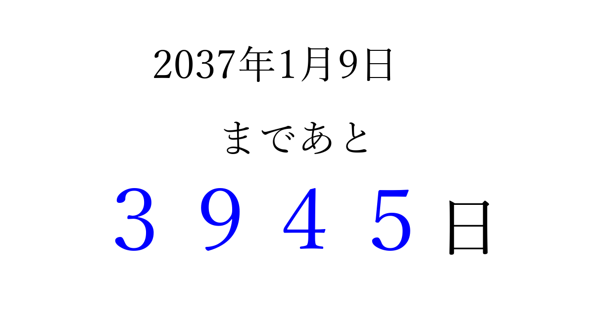 2037年1月9日(金)まで あと 9999 日です 追加すると、トップページからすぐ選べるようになります ※2026/03/23現在の結果です。 最新の状態に更新する ↓シェアして、タイムライン上にカウントダウンを表示しよう!↓ 📤 この結果を共有する Tweet シェア Threads Bluesky 別の日付でカウントダウン 2037年1月のカレンダー このページをブックマークに追加すると、いつでもカウントダウンを確認できます。 (PC: Ctrl+D / Mac: ⌘+D) hitome-notes.comでは以下のページも運営しています。 指定日と期間から日付を計算 | ガチャ確率計算・シミュレーション | プライバシー・ポリシー 運営者:Avocado