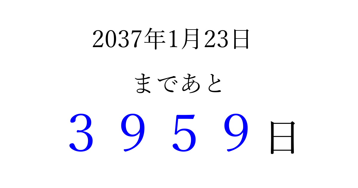 2037年1月23日(金)まで あと 9999 日です 追加すると、トップページからすぐ選べるようになります ※2026/03/23現在の結果です。 最新の状態に更新する ↓シェアして、タイムライン上にカウントダウンを表示しよう!↓ 📤 この結果を共有する Tweet シェア Threads Bluesky 別の日付でカウントダウン 2037年1月のカレンダー このページをブックマークに追加すると、いつでもカウントダウンを確認できます。 (PC: Ctrl+D / Mac: ⌘+D) hitome-notes.comでは以下のページも運営しています。 指定日と期間から日付を計算 | ガチャ確率計算・シミュレーション | プライバシー・ポリシー 運営者:Avocado
