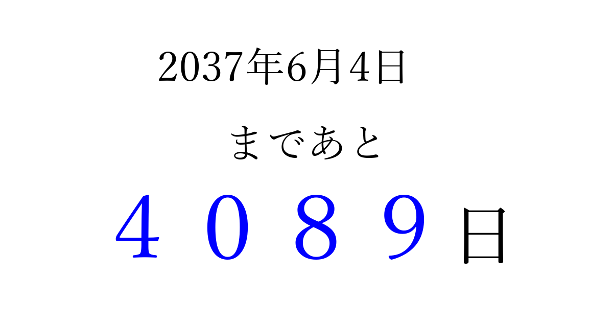 2037年6月4日(木)まで あと 9999 日です 追加すると、トップページからすぐ選べるようになります ※2026/03/25現在の結果です。 最新の状態に更新する ↓シェアして、タイムライン上にカウントダウンを表示しよう!↓ 📤 この結果を共有する Tweet シェア Threads Bluesky 別の日付でカウントダウン 2037年6月のカレンダー このページをブックマークに追加すると、いつでもカウントダウンを確認できます。 (PC: Ctrl+D / Mac: ⌘+D) hitome-notes.comでは以下のページも運営しています。 指定日と期間から日付を計算 | ガチャ確率計算・シミュレーション | プライバシー・ポリシー 運営者:Avocado