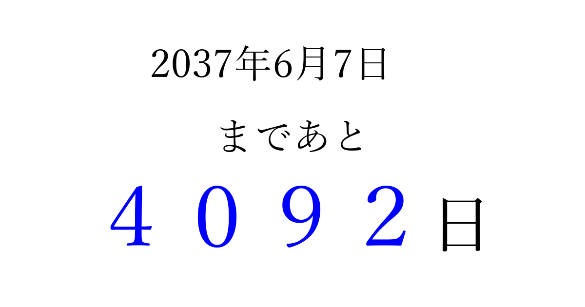 2037年6月7日(日)まで あと 9999 日です 追加すると、トップページからすぐ選べるようになります ※2026/03/25現在の結果です。 最新の状態に更新する ↓シェアして、タイムライン上にカウントダウンを表示しよう!↓ 📤 この結果を共有する Tweet シェア Threads Bluesky 別の日付でカウントダウン 2037年6月のカレンダー このページをブックマークに追加すると、いつでもカウントダウンを確認できます。 (PC: Ctrl+D / Mac: ⌘+D) hitome-notes.comでは以下のページも運営しています。 指定日と期間から日付を計算 | ガチャ確率計算・シミュレーション | プライバシー・ポリシー 運営者:Avocado