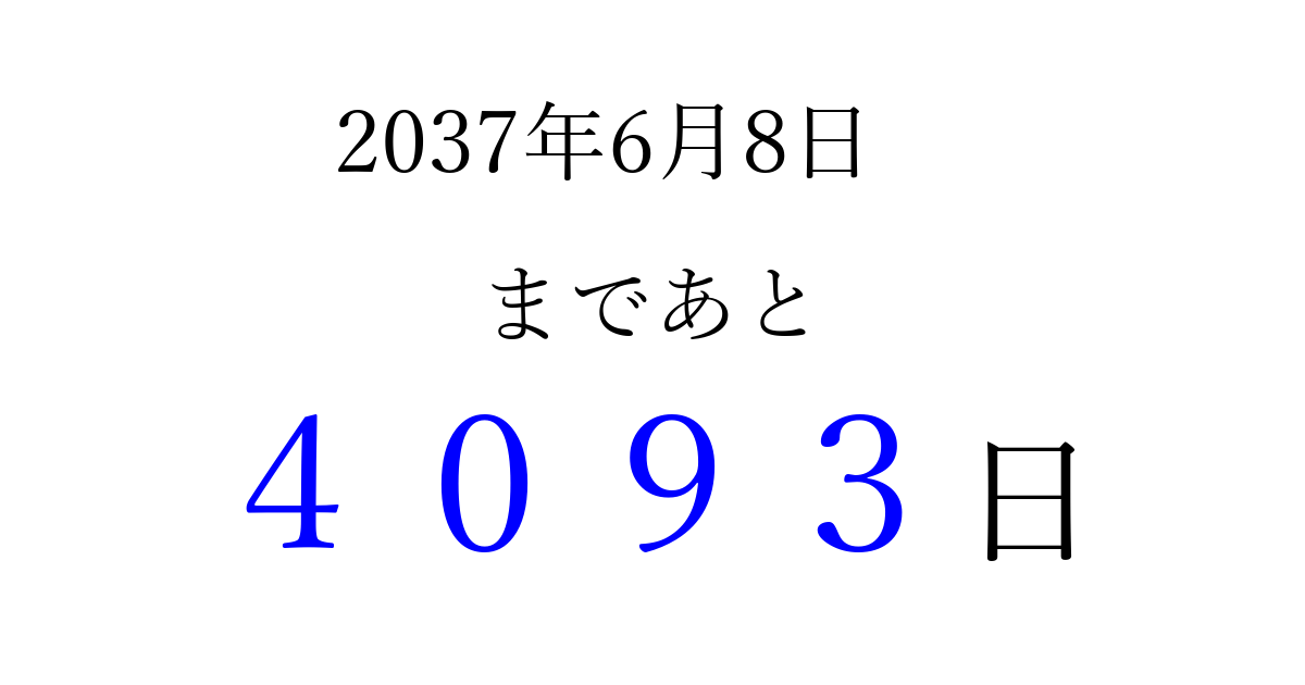 2037年6月8日(月)まで あと 9999 日です 追加すると、トップページからすぐ選べるようになります ※2026/03/25現在の結果です。 最新の状態に更新する ↓シェアして、タイムライン上にカウントダウンを表示しよう!↓ 📤 この結果を共有する Tweet シェア Threads Bluesky 別の日付でカウントダウン 2037年6月のカレンダー このページをブックマークに追加すると、いつでもカウントダウンを確認できます。 (PC: Ctrl+D / Mac: ⌘+D) hitome-notes.comでは以下のページも運営しています。 指定日と期間から日付を計算 | ガチャ確率計算・シミュレーション | プライバシー・ポリシー 運営者:Avocado