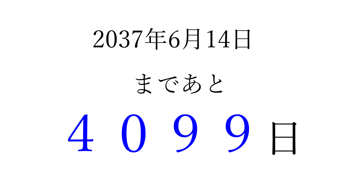 2037年6月14日(日)まで あと 9999 日です 追加すると、トップページからすぐ選べるようになります ※2026/03/25現在の結果です。 最新の状態に更新する ↓シェアして、タイムライン上にカウントダウンを表示しよう!↓ 📤 この結果を共有する Tweet シェア Threads Bluesky 別の日付でカウントダウン 2037年6月のカレンダー このページをブックマークに追加すると、いつでもカウントダウンを確認できます。 (PC: Ctrl+D / Mac: ⌘+D) hitome-notes.comでは以下のページも運営しています。 指定日と期間から日付を計算 | ガチャ確率計算・シミュレーション | プライバシー・ポリシー 運営者:Avocado