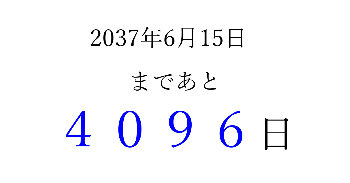 2037年6月15日(月)まで あと 9999 日です 追加すると、トップページからすぐ選べるようになります ※2026/03/29現在の結果です。 最新の状態に更新する ↓シェアして、タイムライン上にカウントダウンを表示しよう!↓ 📤 この結果を共有する Tweet シェア Threads Bluesky 別の日付でカウントダウン 2037年6月のカレンダー このページをブックマークに追加すると、いつでもカウントダウンを確認できます。 (PC: Ctrl+D / Mac: ⌘+D) hitome-notes.comでは以下のページも運営しています。 指定日と期間から日付を計算 | ガチャ確率計算・シミュレーション | プライバシー・ポリシー 運営者:Avocado
