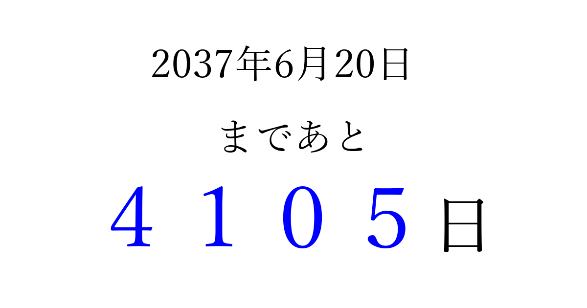 2037年6月20日(土)まで あと 9999 日です 追加すると、トップページからすぐ選べるようになります ※2026/03/25現在の結果です。 最新の状態に更新する ↓シェアして、タイムライン上にカウントダウンを表示しよう!↓ 📤 この結果を共有する Tweet シェア Threads Bluesky 別の日付でカウントダウン 2037年6月のカレンダー このページをブックマークに追加すると、いつでもカウントダウンを確認できます。 (PC: Ctrl+D / Mac: ⌘+D) hitome-notes.comでは以下のページも運営しています。 指定日と期間から日付を計算 | ガチャ確率計算・シミュレーション | プライバシー・ポリシー 運営者:Avocado