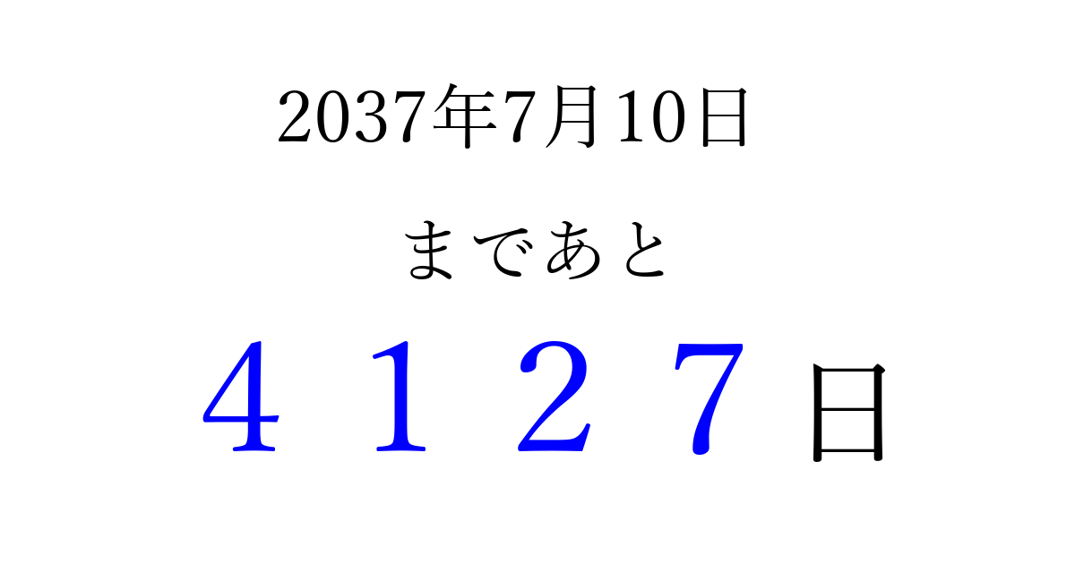 2037年7月10日(金)まで あと 9999 日です 追加すると、トップページからすぐ選べるようになります ※2026/03/23現在の結果です。 最新の状態に更新する ↓シェアして、タイムライン上にカウントダウンを表示しよう!↓ 📤 この結果を共有する Tweet シェア Threads Bluesky 別の日付でカウントダウン 2037年7月のカレンダー このページをブックマークに追加すると、いつでもカウントダウンを確認できます。 (PC: Ctrl+D / Mac: ⌘+D) hitome-notes.comでは以下のページも運営しています。 指定日と期間から日付を計算 | ガチャ確率計算・シミュレーション | プライバシー・ポリシー 運営者:Avocado