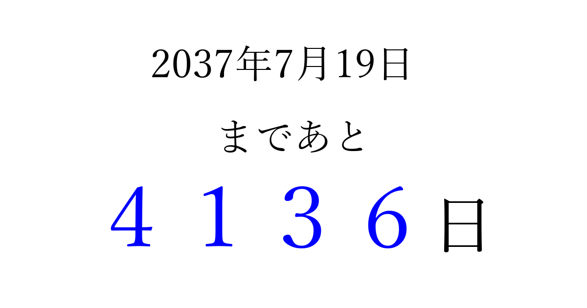 2037年7月19日(日)まで あと 9999 日です 追加すると、トップページからすぐ選べるようになります ※2026/03/23現在の結果です。 最新の状態に更新する ↓シェアして、タイムライン上にカウントダウンを表示しよう!↓ 📤 この結果を共有する Tweet シェア Threads Bluesky 別の日付でカウントダウン 2037年7月のカレンダー このページをブックマークに追加すると、いつでもカウントダウンを確認できます。 (PC: Ctrl+D / Mac: ⌘+D) hitome-notes.comでは以下のページも運営しています。 指定日と期間から日付を計算 | ガチャ確率計算・シミュレーション | プライバシー・ポリシー 運営者:Avocado