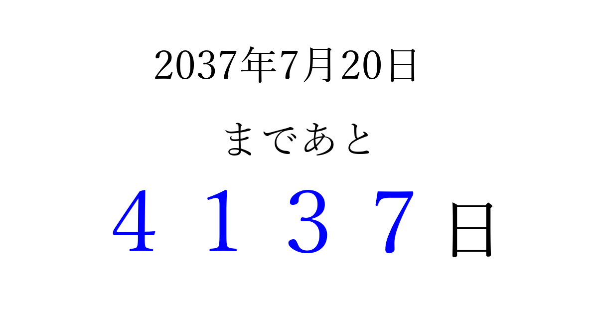 2037年7月20日(月)まで あと 9999 日です 追加すると、トップページからすぐ選べるようになります ※2026/03/23現在の結果です。 最新の状態に更新する ↓シェアして、タイムライン上にカウントダウンを表示しよう!↓ 📤 この結果を共有する Tweet シェア Threads Bluesky 別の日付でカウントダウン 2037年7月のカレンダー このページをブックマークに追加すると、いつでもカウントダウンを確認できます。 (PC: Ctrl+D / Mac: ⌘+D) hitome-notes.comでは以下のページも運営しています。 指定日と期間から日付を計算 | ガチャ確率計算・シミュレーション | プライバシー・ポリシー 運営者:Avocado