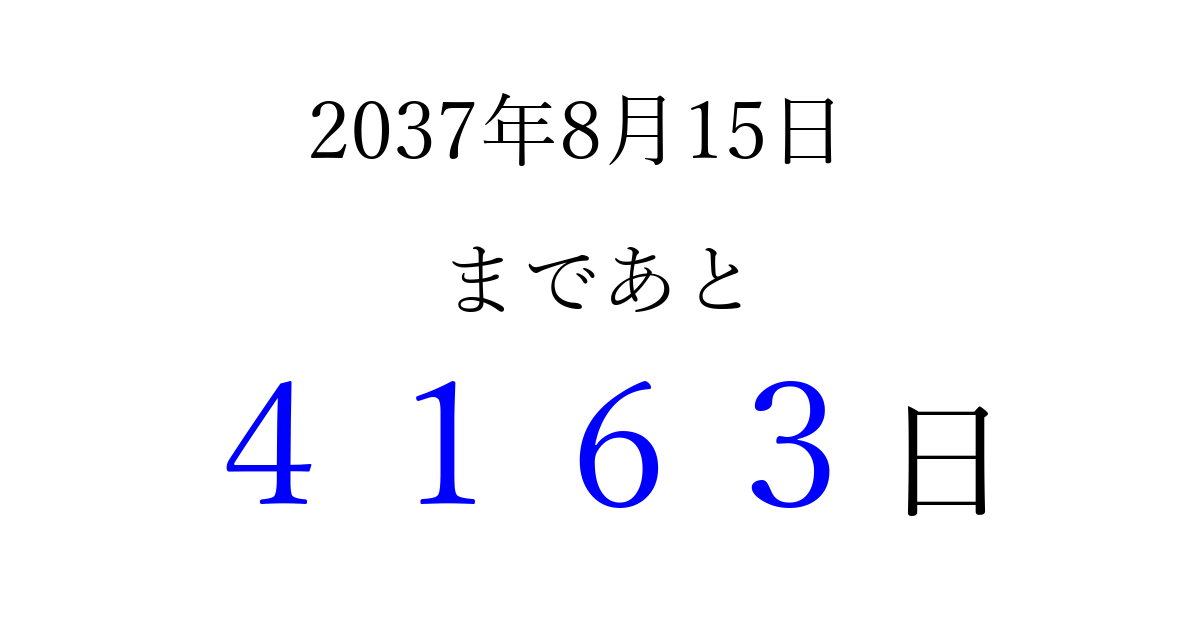 2037年8月15日(土)まで あと 9999 日です 追加すると、トップページからすぐ選べるようになります ※2026/03/23現在の結果です。 最新の状態に更新する ↓シェアして、タイムライン上にカウントダウンを表示しよう!↓ 📤 この結果を共有する Tweet シェア Threads Bluesky 別の日付でカウントダウン 2037年8月のカレンダー このページをブックマークに追加すると、いつでもカウントダウンを確認できます。 (PC: Ctrl+D / Mac: ⌘+D) hitome-notes.comでは以下のページも運営しています。 指定日と期間から日付を計算 | ガチャ確率計算・シミュレーション | プライバシー・ポリシー 運営者:Avocado