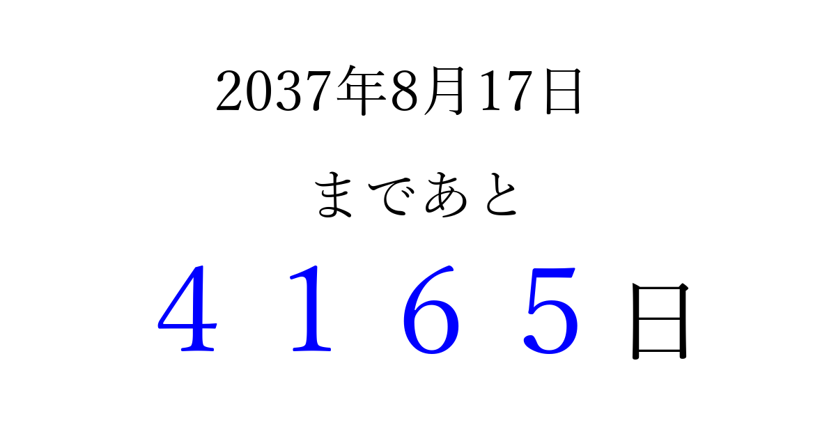 2037年8月17日(月)まで あと 9999 日です 追加すると、トップページからすぐ選べるようになります ※2026/03/23現在の結果です。 最新の状態に更新する ↓シェアして、タイムライン上にカウントダウンを表示しよう!↓ 📤 この結果を共有する Tweet シェア Threads Bluesky 別の日付でカウントダウン 2037年8月のカレンダー このページをブックマークに追加すると、いつでもカウントダウンを確認できます。 (PC: Ctrl+D / Mac: ⌘+D) hitome-notes.comでは以下のページも運営しています。 指定日と期間から日付を計算 | ガチャ確率計算・シミュレーション | プライバシー・ポリシー 運営者:Avocado