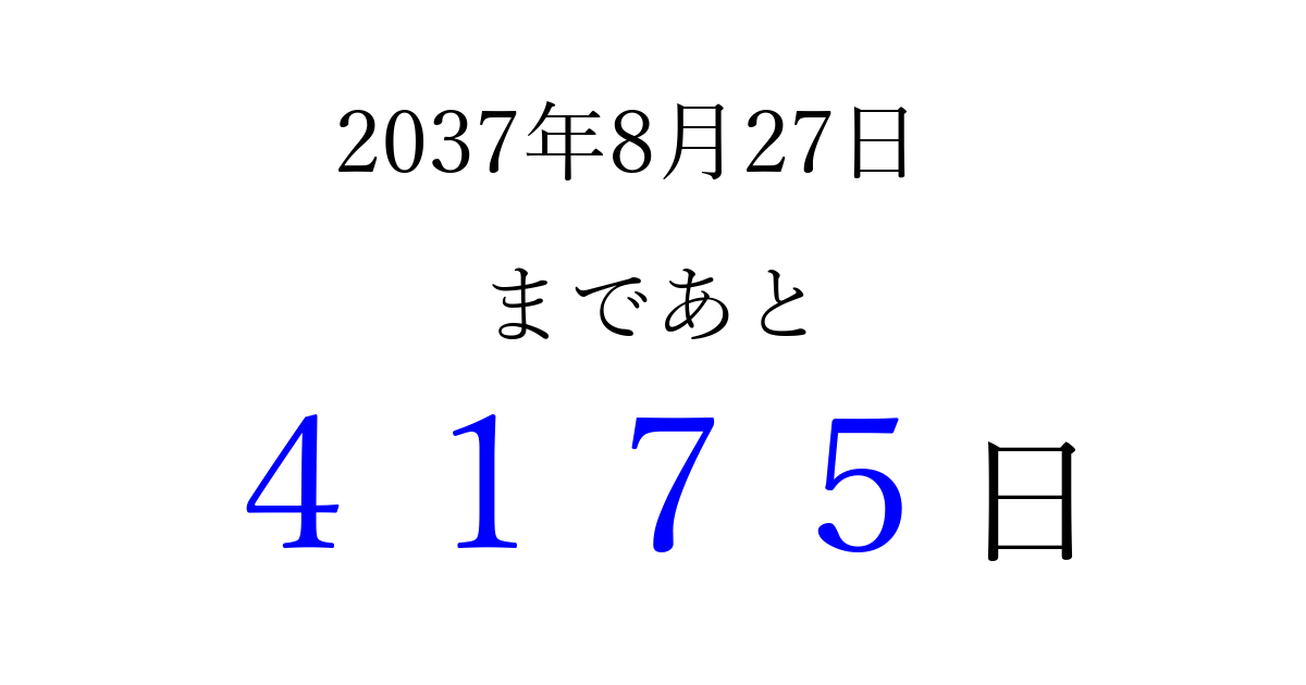 2037年8月27日(木)まで あと 9999 日です 追加すると、トップページからすぐ選べるようになります ※2026/03/23現在の結果です。 最新の状態に更新する ↓シェアして、タイムライン上にカウントダウンを表示しよう!↓ 📤 この結果を共有する Tweet シェア Threads Bluesky 別の日付でカウントダウン 2037年8月のカレンダー このページをブックマークに追加すると、いつでもカウントダウンを確認できます。 (PC: Ctrl+D / Mac: ⌘+D) hitome-notes.comでは以下のページも運営しています。 指定日と期間から日付を計算 | ガチャ確率計算・シミュレーション | プライバシー・ポリシー 運営者:Avocado