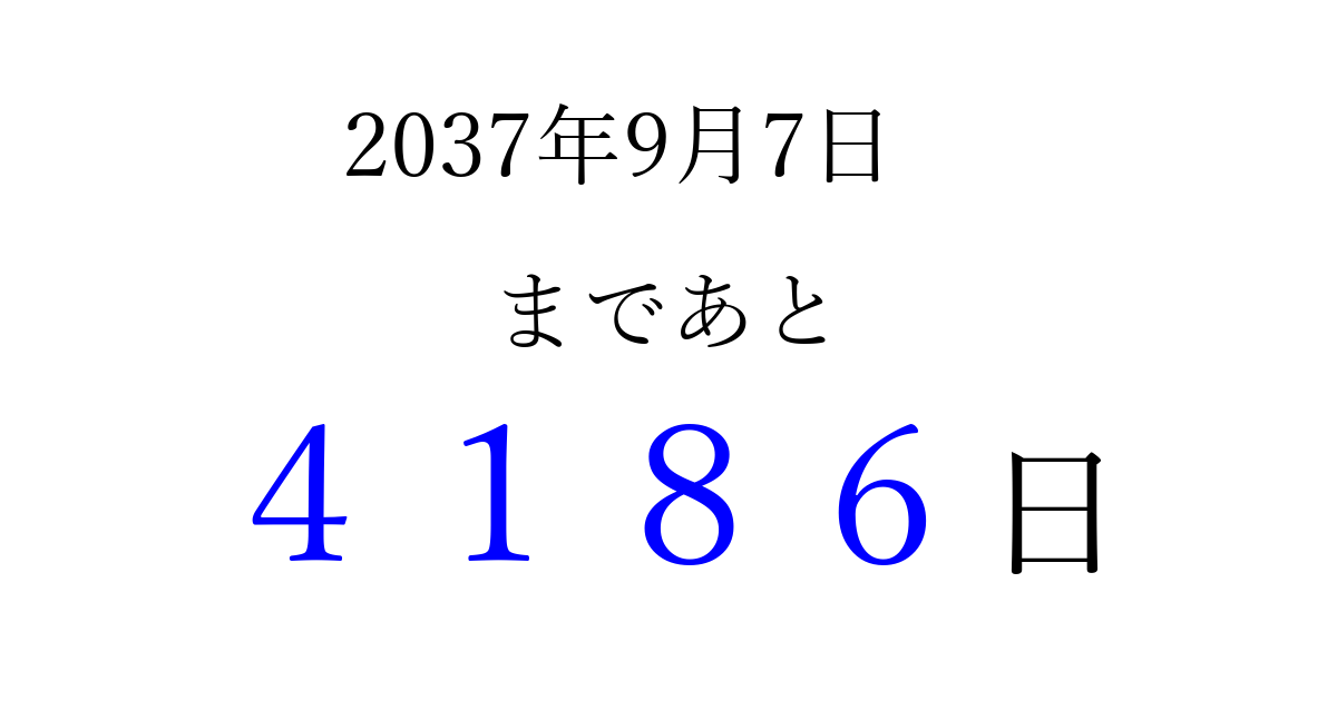 2037年9月7日(月)まで あと 9999 日です 追加すると、トップページからすぐ選べるようになります ※2026/03/23現在の結果です。 最新の状態に更新する ↓シェアして、タイムライン上にカウントダウンを表示しよう!↓ 📤 この結果を共有する Tweet シェア Threads Bluesky 別の日付でカウントダウン 2037年9月のカレンダー このページをブックマークに追加すると、いつでもカウントダウンを確認できます。 (PC: Ctrl+D / Mac: ⌘+D) hitome-notes.comでは以下のページも運営しています。 指定日と期間から日付を計算 | ガチャ確率計算・シミュレーション | プライバシー・ポリシー 運営者:Avocado