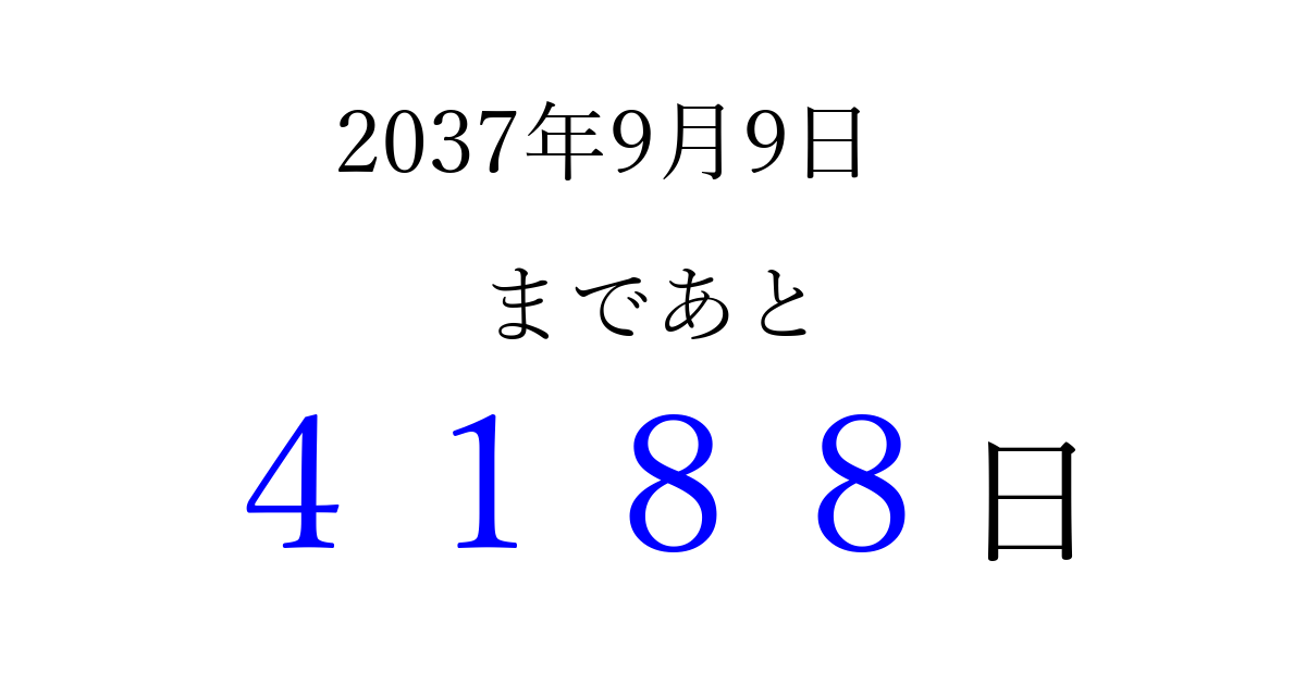2037年9月9日(水)まで あと 9999 日です 追加すると、トップページからすぐ選べるようになります ※2026/03/23現在の結果です。 最新の状態に更新する ↓シェアして、タイムライン上にカウントダウンを表示しよう!↓ 📤 この結果を共有する Tweet シェア Threads Bluesky 別の日付でカウントダウン 2037年9月のカレンダー このページをブックマークに追加すると、いつでもカウントダウンを確認できます。 (PC: Ctrl+D / Mac: ⌘+D) hitome-notes.comでは以下のページも運営しています。 指定日と期間から日付を計算 | ガチャ確率計算・シミュレーション | プライバシー・ポリシー 運営者:Avocado