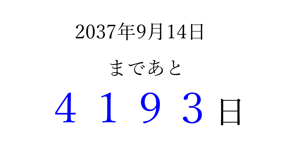 2037年9月14日(月)まで あと 9999 日です 追加すると、トップページからすぐ選べるようになります ※2026/03/23現在の結果です。 最新の状態に更新する ↓シェアして、タイムライン上にカウントダウンを表示しよう!↓ 📤 この結果を共有する Tweet シェア Threads Bluesky 別の日付でカウントダウン 2037年9月のカレンダー このページをブックマークに追加すると、いつでもカウントダウンを確認できます。 (PC: Ctrl+D / Mac: ⌘+D) hitome-notes.comでは以下のページも運営しています。 指定日と期間から日付を計算 | ガチャ確率計算・シミュレーション | プライバシー・ポリシー 運営者:Avocado