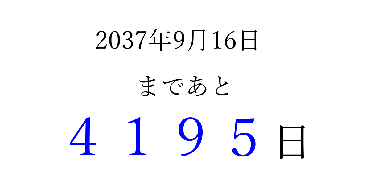 2037年9月16日(水)まで あと 9999 日です 追加すると、トップページからすぐ選べるようになります ※2026/03/23現在の結果です。 最新の状態に更新する ↓シェアして、タイムライン上にカウントダウンを表示しよう!↓ 📤 この結果を共有する Tweet シェア Threads Bluesky 別の日付でカウントダウン 2037年9月のカレンダー このページをブックマークに追加すると、いつでもカウントダウンを確認できます。 (PC: Ctrl+D / Mac: ⌘+D) hitome-notes.comでは以下のページも運営しています。 指定日と期間から日付を計算 | ガチャ確率計算・シミュレーション | プライバシー・ポリシー 運営者:Avocado