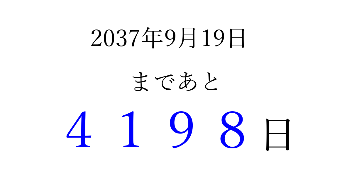 2037年9月19日(土)まで あと 9999 日です 追加すると、トップページからすぐ選べるようになります ※2026/03/23現在の結果です。 最新の状態に更新する ↓シェアして、タイムライン上にカウントダウンを表示しよう!↓ 📤 この結果を共有する Tweet シェア Threads Bluesky 別の日付でカウントダウン 2037年9月のカレンダー このページをブックマークに追加すると、いつでもカウントダウンを確認できます。 (PC: Ctrl+D / Mac: ⌘+D) hitome-notes.comでは以下のページも運営しています。 指定日と期間から日付を計算 | ガチャ確率計算・シミュレーション | プライバシー・ポリシー 運営者:Avocado
