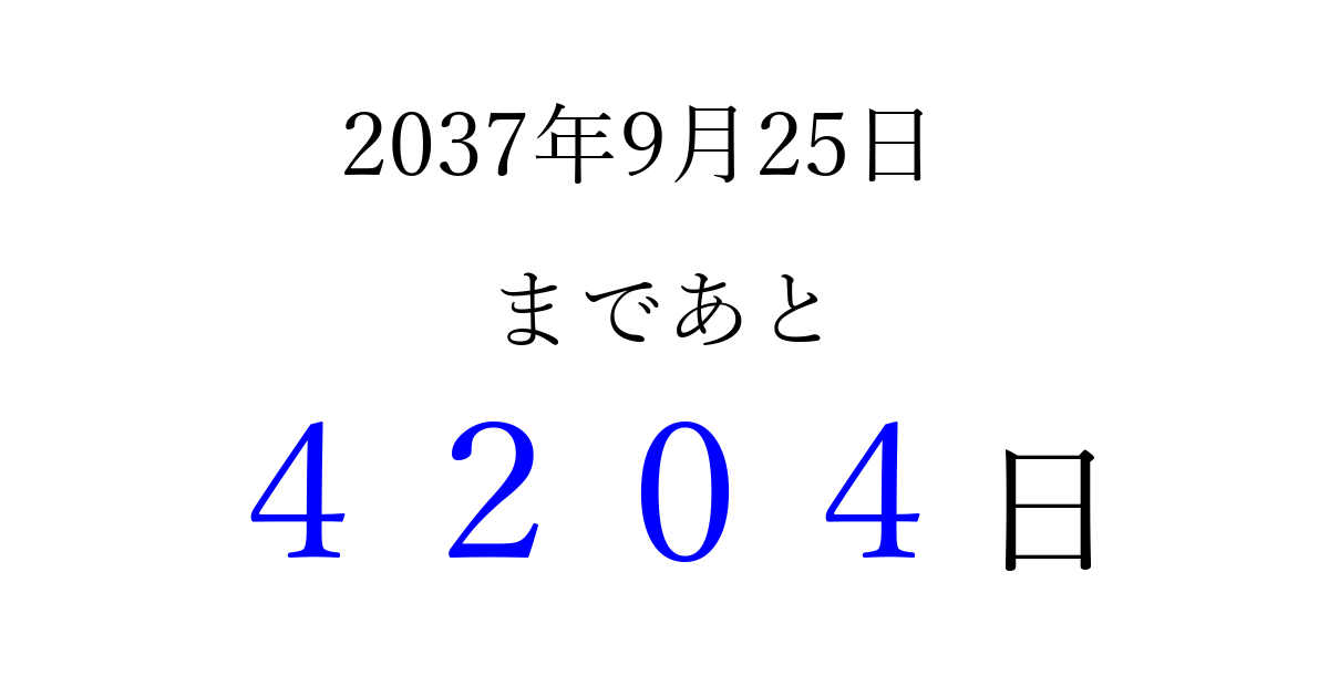 2037年9月25日(金)まで あと 9999 日です 追加すると、トップページからすぐ選べるようになります ※2026/03/23現在の結果です。 最新の状態に更新する ↓シェアして、タイムライン上にカウントダウンを表示しよう!↓ 📤 この結果を共有する Tweet シェア Threads Bluesky 別の日付でカウントダウン 2037年9月のカレンダー このページをブックマークに追加すると、いつでもカウントダウンを確認できます。 (PC: Ctrl+D / Mac: ⌘+D) hitome-notes.comでは以下のページも運営しています。 指定日と期間から日付を計算 | ガチャ確率計算・シミュレーション | プライバシー・ポリシー 運営者:Avocado