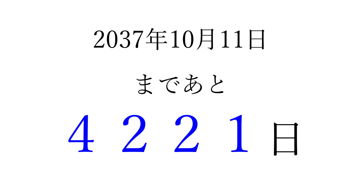 2037年10月11日(日)まで あと 9999 日です 追加すると、トップページからすぐ選べるようになります ※2026/03/22現在の結果です。 最新の状態に更新する ↓シェアして、タイムライン上にカウントダウンを表示しよう!↓ 📤 この結果を共有する Tweet シェア Threads Bluesky 別の日付でカウントダウン 2037年10月のカレンダー このページをブックマークに追加すると、いつでもカウントダウンを確認できます。 (PC: Ctrl+D / Mac: ⌘+D) hitome-notes.comでは以下のページも運営しています。 指定日と期間から日付を計算 | ガチャ確率計算・シミュレーション | プライバシー・ポリシー 運営者:Avocado