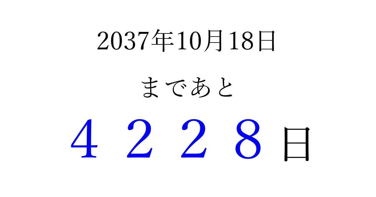 2037年10月18日(日)まで あと 9999 日です 追加すると、トップページからすぐ選べるようになります ※2026/03/22現在の結果です。 最新の状態に更新する ↓シェアして、タイムライン上にカウントダウンを表示しよう!↓ 📤 この結果を共有する Tweet シェア Threads Bluesky 別の日付でカウントダウン 2037年10月のカレンダー このページをブックマークに追加すると、いつでもカウントダウンを確認できます。 (PC: Ctrl+D / Mac: ⌘+D) hitome-notes.comでは以下のページも運営しています。 指定日と期間から日付を計算 | ガチャ確率計算・シミュレーション | プライバシー・ポリシー 運営者:Avocado