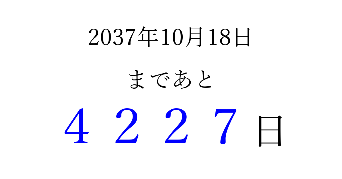 2037年10月18日(日)まで あと 9999 日です 追加すると、トップページからすぐ選べるようになります ※2026/03/23現在の結果です。 最新の状態に更新する ↓シェアして、タイムライン上にカウントダウンを表示しよう!↓ 📤 この結果を共有する Tweet シェア Threads Bluesky 別の日付でカウントダウン 2037年10月のカレンダー このページをブックマークに追加すると、いつでもカウントダウンを確認できます。 (PC: Ctrl+D / Mac: ⌘+D) hitome-notes.comでは以下のページも運営しています。 指定日と期間から日付を計算 | ガチャ確率計算・シミュレーション | プライバシー・ポリシー 運営者:Avocado