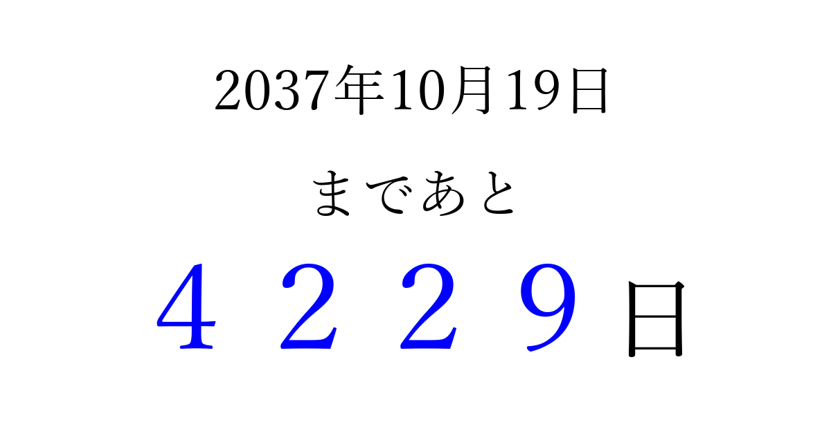 2037年10月19日(月)まで あと 9999 日です 追加すると、トップページからすぐ選べるようになります ※2026/03/22現在の結果です。 最新の状態に更新する ↓シェアして、タイムライン上にカウントダウンを表示しよう!↓ 📤 この結果を共有する Tweet シェア Threads Bluesky 別の日付でカウントダウン 2037年10月のカレンダー このページをブックマークに追加すると、いつでもカウントダウンを確認できます。 (PC: Ctrl+D / Mac: ⌘+D) hitome-notes.comでは以下のページも運営しています。 指定日と期間から日付を計算 | ガチャ確率計算・シミュレーション | プライバシー・ポリシー 運営者:Avocado