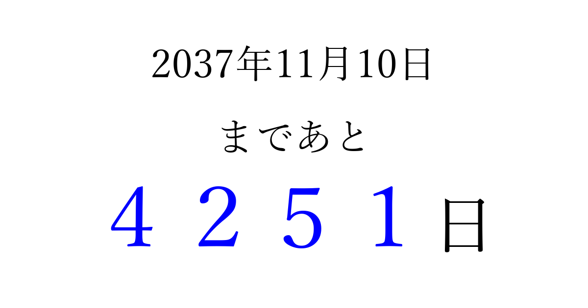 2037年11月10日(火)まで あと 9999 日です 追加すると、トップページからすぐ選べるようになります ※2026/03/22現在の結果です。 最新の状態に更新する ↓シェアして、タイムライン上にカウントダウンを表示しよう!↓ 📤 この結果を共有する Tweet シェア Threads Bluesky 別の日付でカウントダウン 2037年11月のカレンダー このページをブックマークに追加すると、いつでもカウントダウンを確認できます。 (PC: Ctrl+D / Mac: ⌘+D) hitome-notes.comでは以下のページも運営しています。 指定日と期間から日付を計算 | ガチャ確率計算・シミュレーション | プライバシー・ポリシー 運営者:Avocado