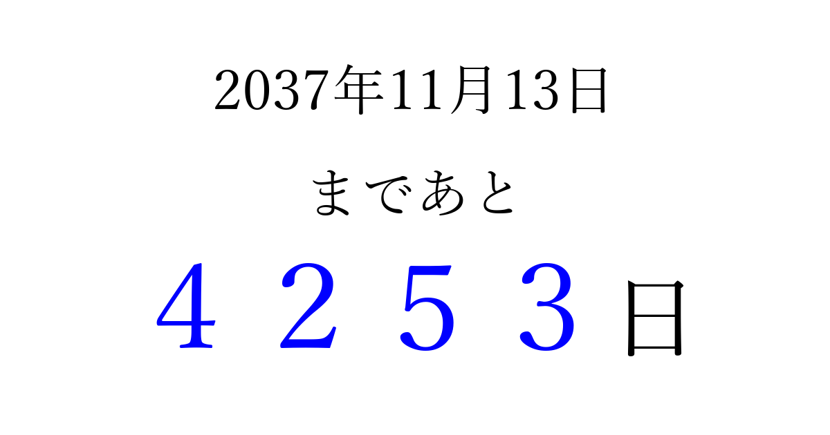 2037年11月13日(金)まで あと 9999 日です 追加すると、トップページからすぐ選べるようになります ※2026/03/23現在の結果です。 最新の状態に更新する ↓シェアして、タイムライン上にカウントダウンを表示しよう!↓ 📤 この結果を共有する Tweet シェア Threads Bluesky 別の日付でカウントダウン 2037年11月のカレンダー このページをブックマークに追加すると、いつでもカウントダウンを確認できます。 (PC: Ctrl+D / Mac: ⌘+D) hitome-notes.comでは以下のページも運営しています。 指定日と期間から日付を計算 | ガチャ確率計算・シミュレーション | プライバシー・ポリシー 運営者:Avocado