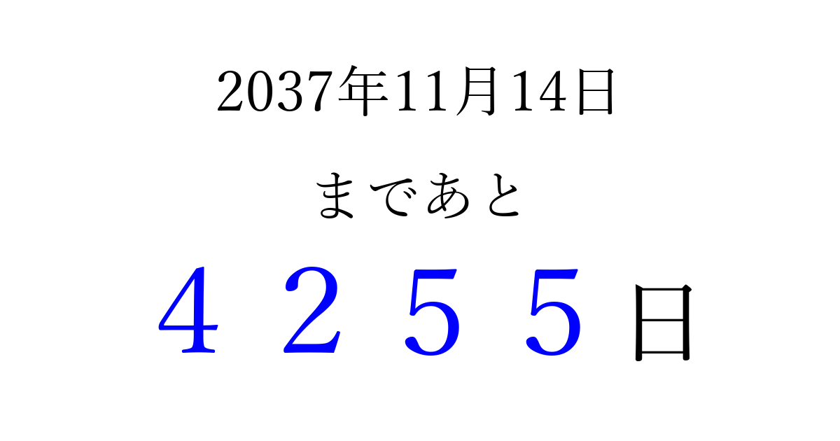 2037年11月14日(土)まで あと 9999 日です 追加すると、トップページからすぐ選べるようになります ※2026/03/22現在の結果です。 最新の状態に更新する ↓シェアして、タイムライン上にカウントダウンを表示しよう!↓ 📤 この結果を共有する Tweet シェア Threads Bluesky 別の日付でカウントダウン 2037年11月のカレンダー このページをブックマークに追加すると、いつでもカウントダウンを確認できます。 (PC: Ctrl+D / Mac: ⌘+D) hitome-notes.comでは以下のページも運営しています。 指定日と期間から日付を計算 | ガチャ確率計算・シミュレーション | プライバシー・ポリシー 運営者:Avocado