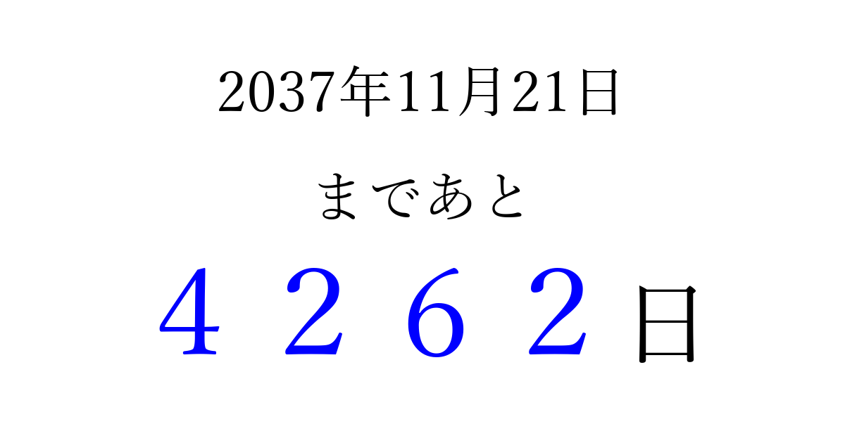2037年11月21日(土)まで あと 9999 日です 追加すると、トップページからすぐ選べるようになります ※2026/03/22現在の結果です。 最新の状態に更新する ↓シェアして、タイムライン上にカウントダウンを表示しよう!↓ 📤 この結果を共有する Tweet シェア Threads Bluesky 別の日付でカウントダウン 2037年11月のカレンダー このページをブックマークに追加すると、いつでもカウントダウンを確認できます。 (PC: Ctrl+D / Mac: ⌘+D) hitome-notes.comでは以下のページも運営しています。 指定日と期間から日付を計算 | ガチャ確率計算・シミュレーション | プライバシー・ポリシー 運営者:Avocado